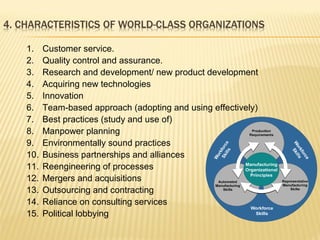 Up to 3 cash back There are three main principles which drive world-class manufacturing. Let us look at the fundamental principles of World Class Manufacturing. Deployment where are the losses.